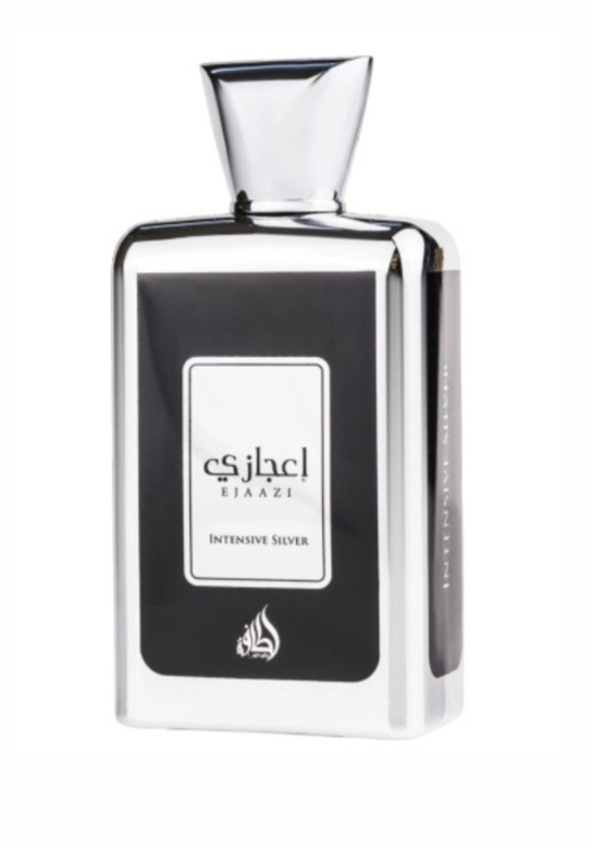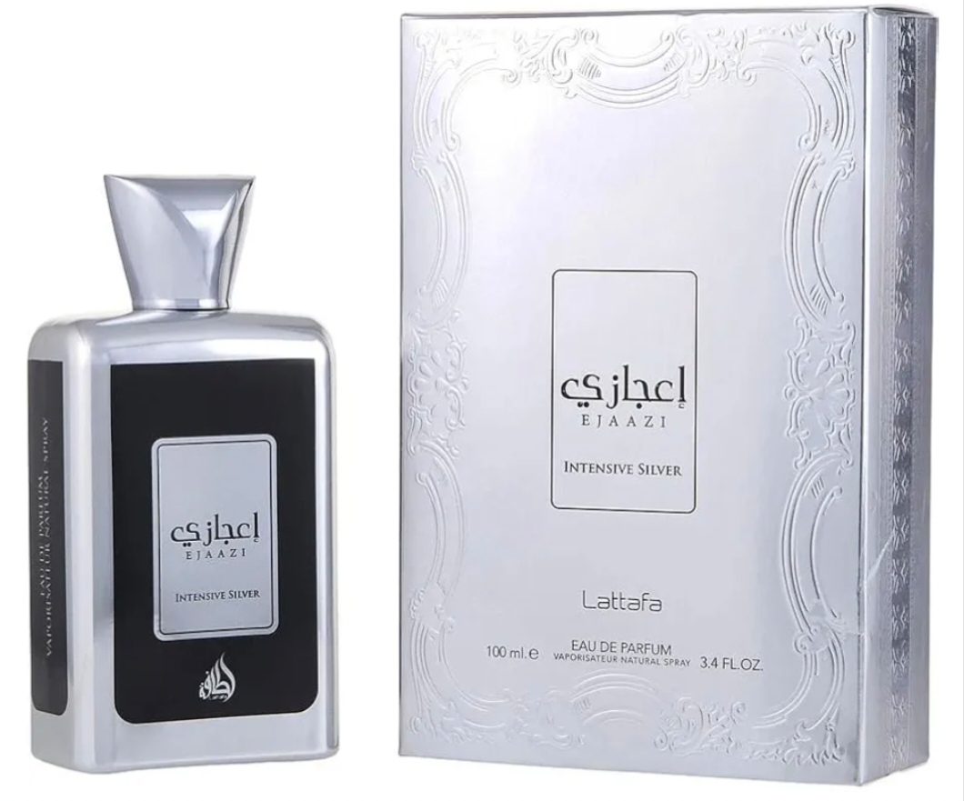 Ejaazi Intensive Silver de Lattafa Perfumes es una fragancia aromática afrutada para mujeres y hombres. Ejaazi Intensive Silver se lanzó en 2021. Las Notas de Salida son Naranja Mandarina y Toronja; las Notas de Medio son Cedro y Notas de Mar; las Notas de Fondo son Ámbar y Musgo.