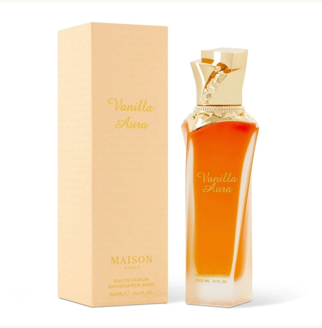 Vanilla Aura de MAISON ASRAR es una fragancia de la familia olfativa Oriental Vainilla para Hombres y Mujeres. Esta fragrancia es nueva. Vanilla Aura se lanzó en 2025. Las Notas de Salida son bergamota, lirio de los valles (muguete) y limón (lima ácida); las Notas de Corazón son vainilla, chocolate y caramelo; las Notas de Fondo son sándalo, ámbar, vainilla y haba tonka